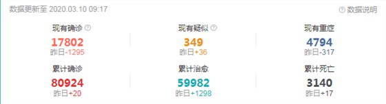 截止3月10日上午,全国疫情病毒现存确诊17802例,现存疑似病例349例,现存重症病例4794例,累计确诊80924例,累计治愈59982例,累计死亡3140例。现存确诊人数和现存重症人数正在不断的减少,疫情病毒每天都在呈好的方向发展。而在此次感染疫情病毒中死亡的人数已经达到了3140例。死亡人数还在每天增加。